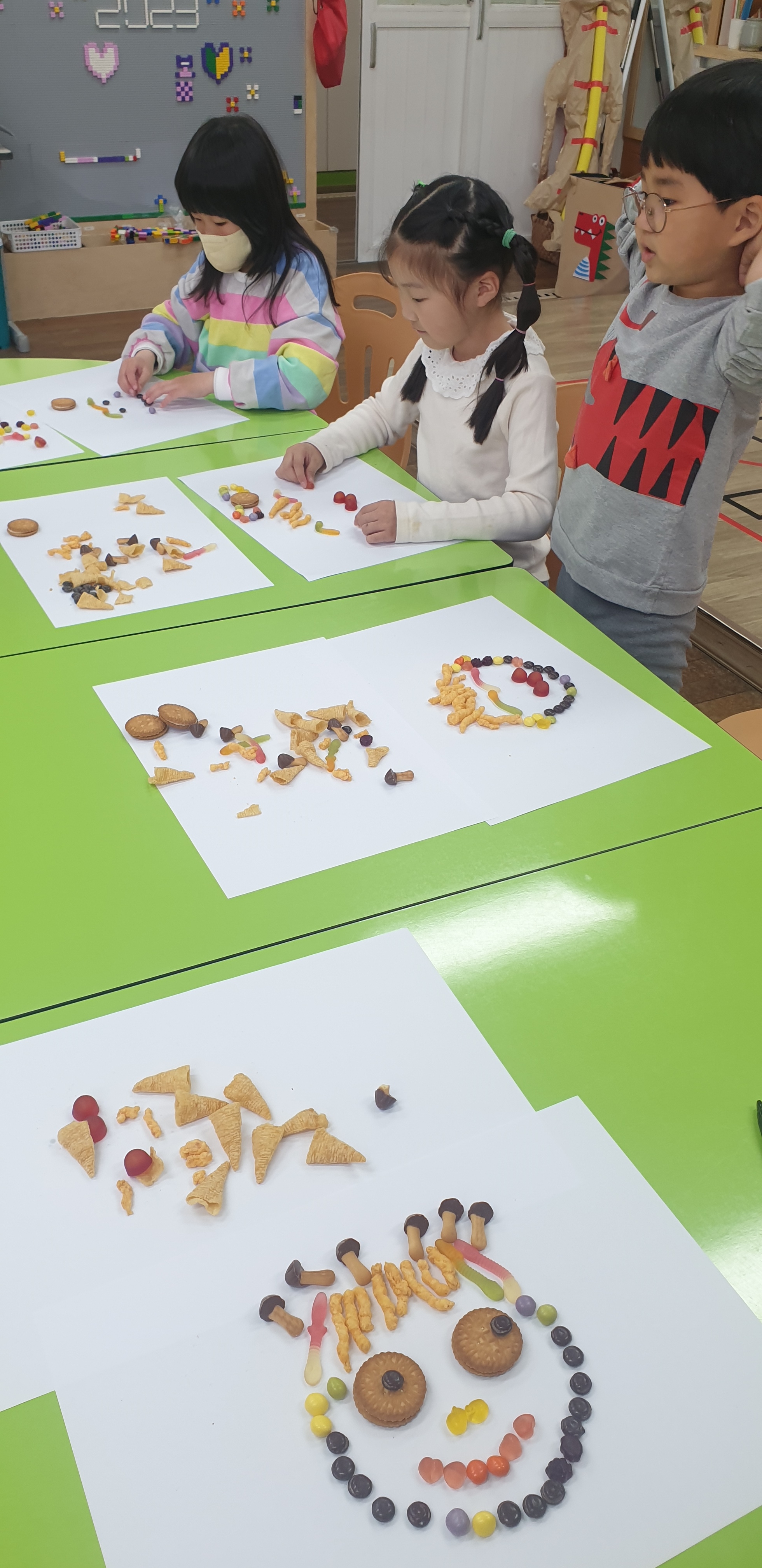 <푸드와 놀이로 함께하는 집단상담>1~2학년을 대상으로 하는 푸드 및 놀이로 함께 하는 집담상담(3회기)중 두번째 시간 활동을 하였습니다.알록달록 맛있고 예쁜 과자들로 친구이름도 친구얼굴도 만들어보았습니다.함께 다녀온 벚꽃놀이를 생각하며 협동작품도 만들었어요.맛있고 신나는 시간이 되었습니다.^^
