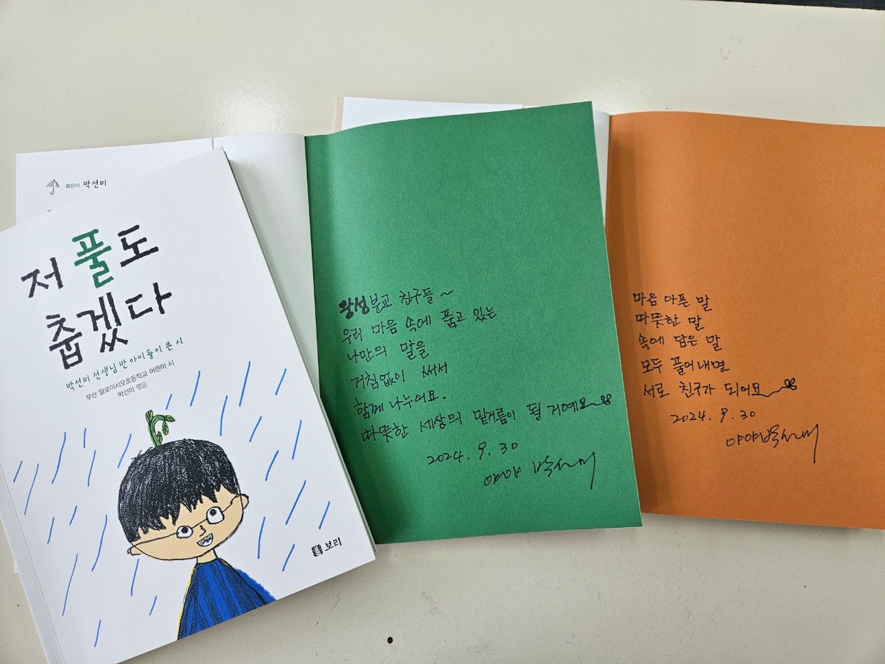 * 작가: 박선미선생님(한국글쓰기교육연구회 이사, 부산알로이시오초등학교 교사/ 어린이시집 '저 풀도 춥겠다', '부러운 새끼개' 등 다소)